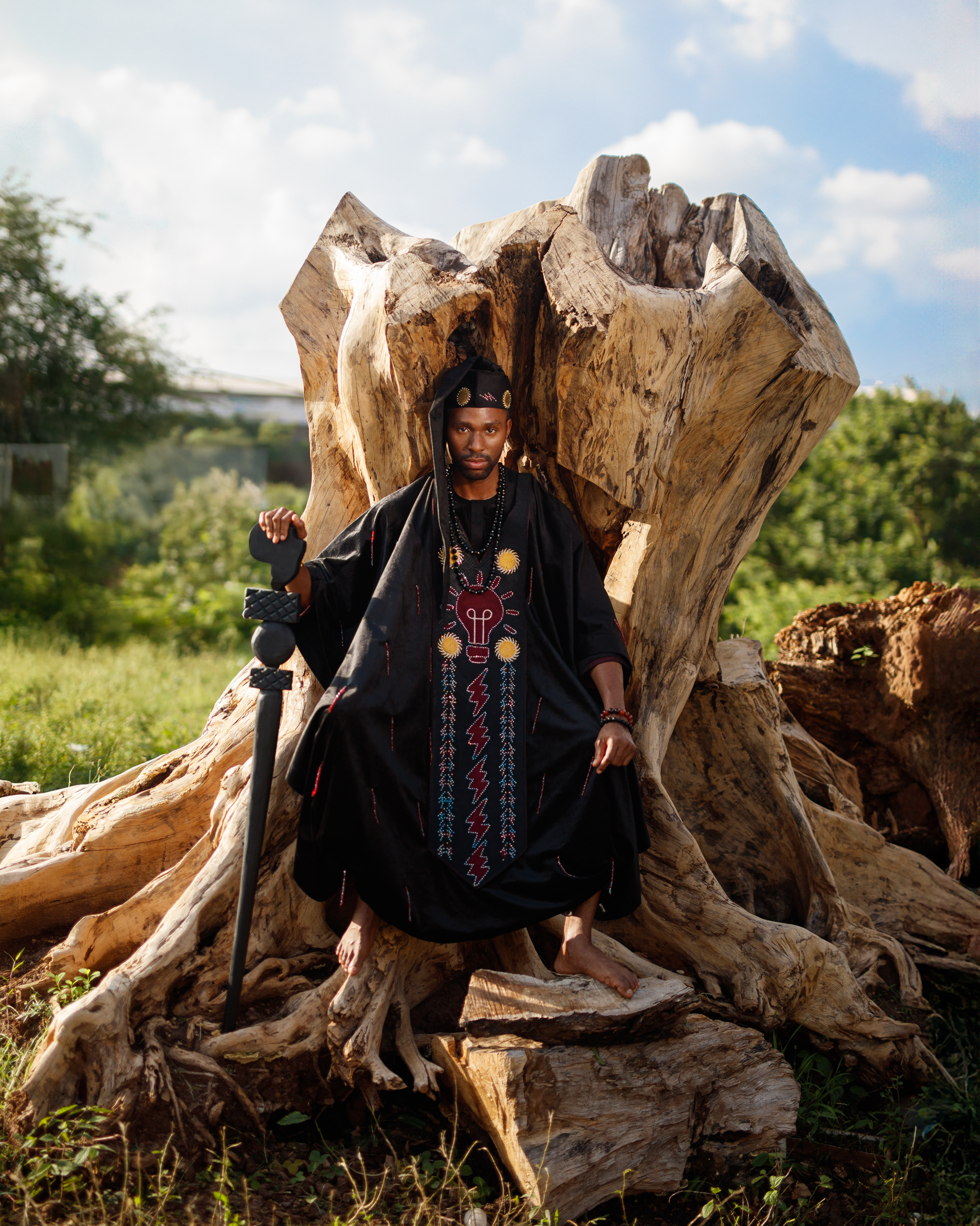 Introducing Egúngún from the Muunganisho collection. Egúngún literally translates to Masquerade. A visible manifestation of the spirits of departed ancestors and gods in Yorubaland. Our imagination of a fashionable twist to the typical Egúngún regalia is a black 3 piece set consisting of Pants with side pockets detail, a fringed…