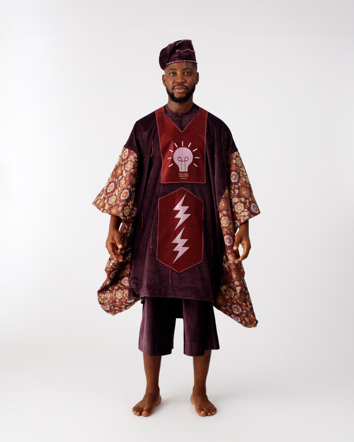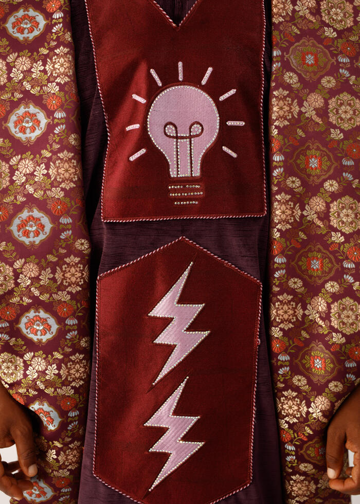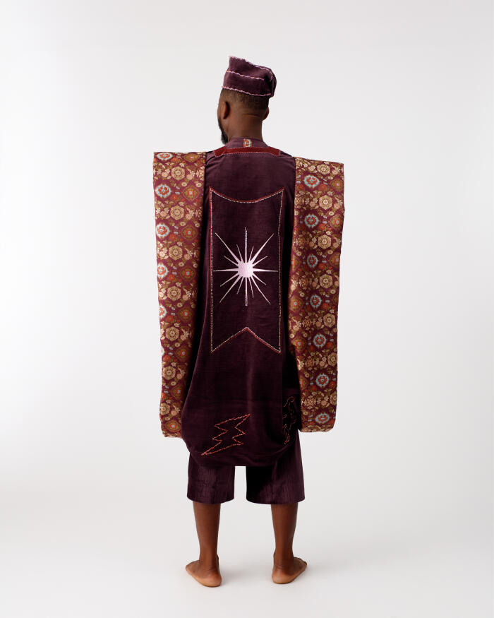Agbádá Olọ́ṣọ is designed with velvet, damask, and embellished with beads and embroidered with fine threads depicting symbols of light and the sun.