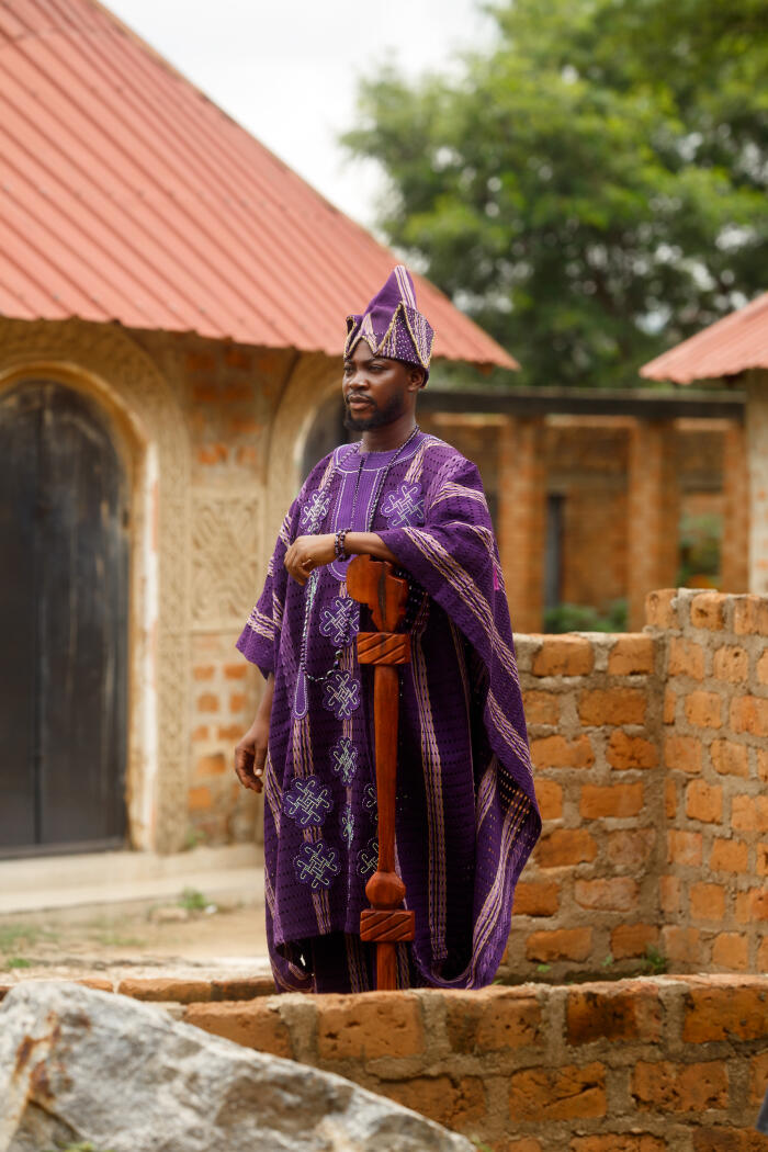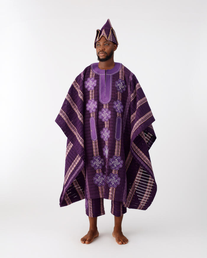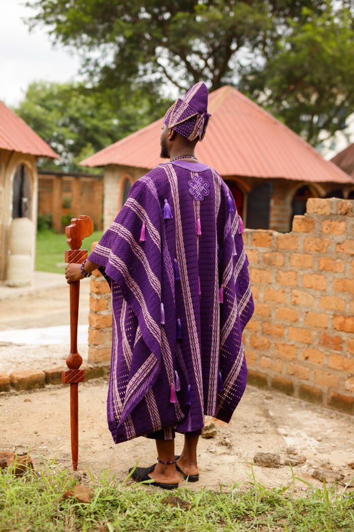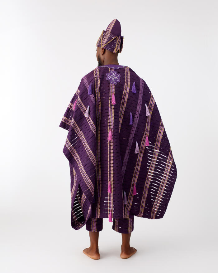 Aládé Àlááfíà is designed with Onjaawu Aso oke, bank of the north embroidery, tassels and embellished with Swarovski stones.