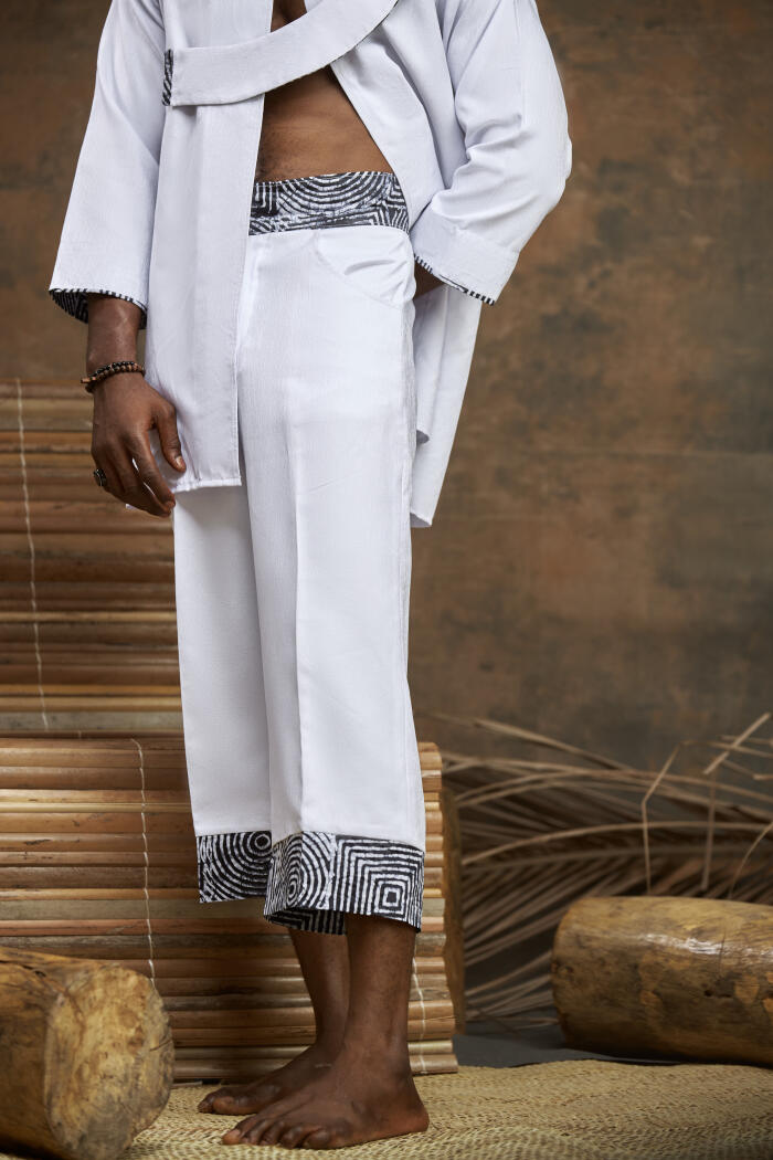 Our Baálè is a 2-piece set kembe three-quarter pants made with french cotton, batik, and adire with a matching and cape-like neckline detail.