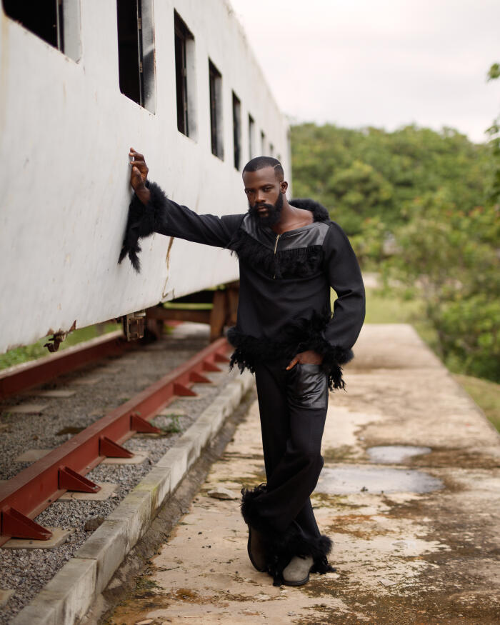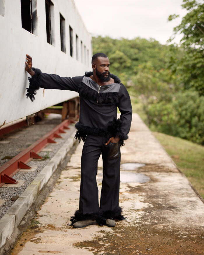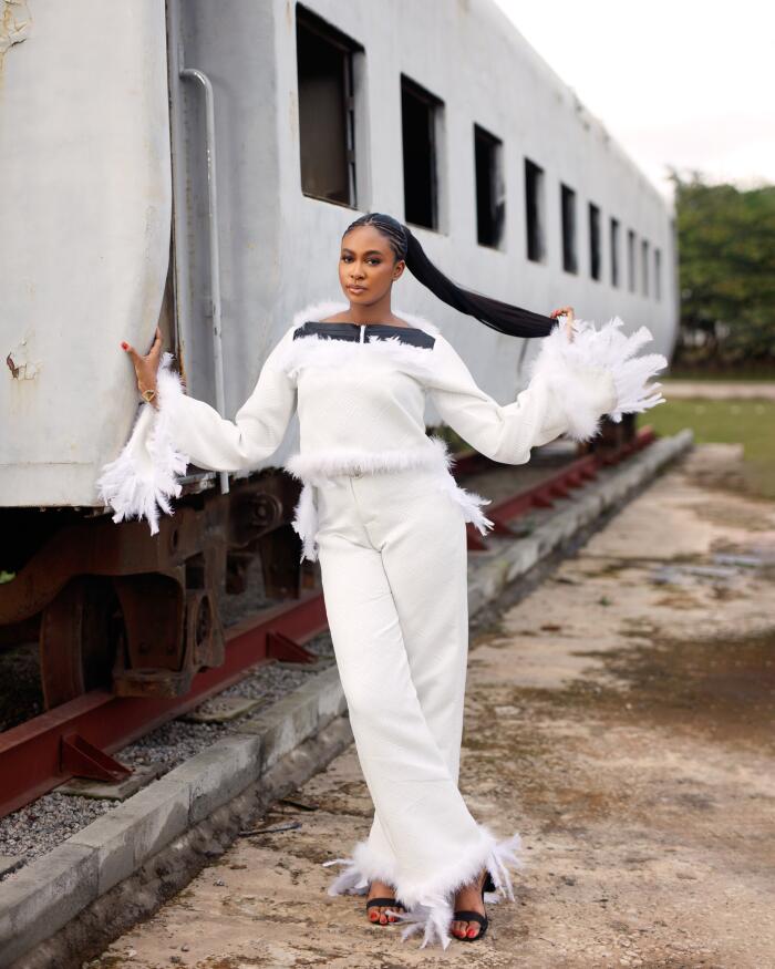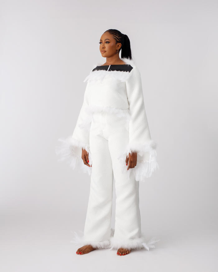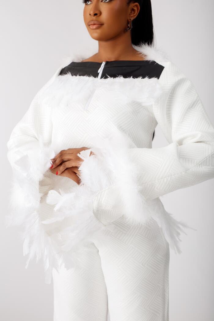 Our Nduru set is designed with textured cotton, sheep wool, dove feathers and leather. The pants can be styled with other wardrobe staples.