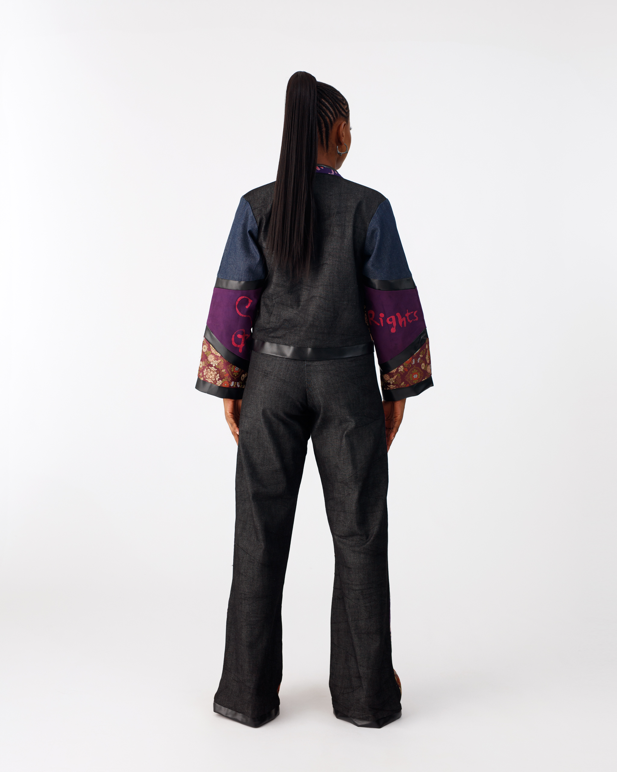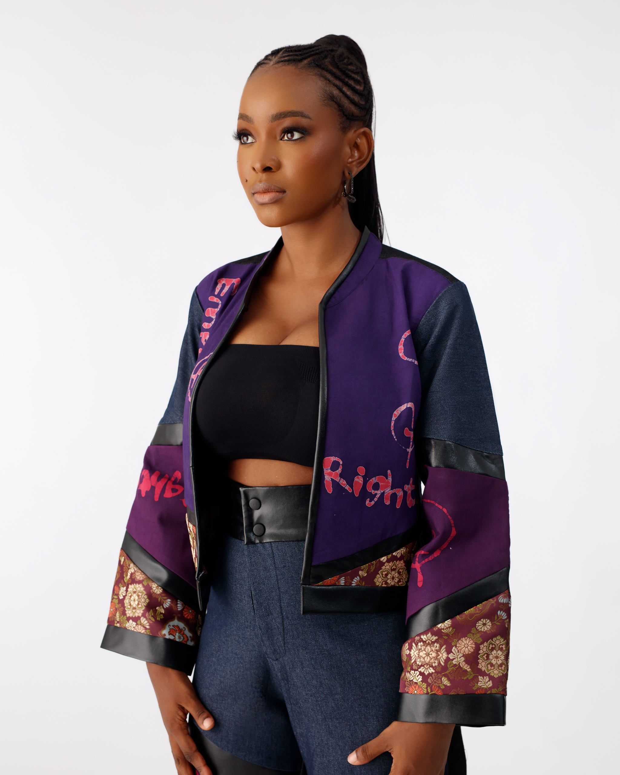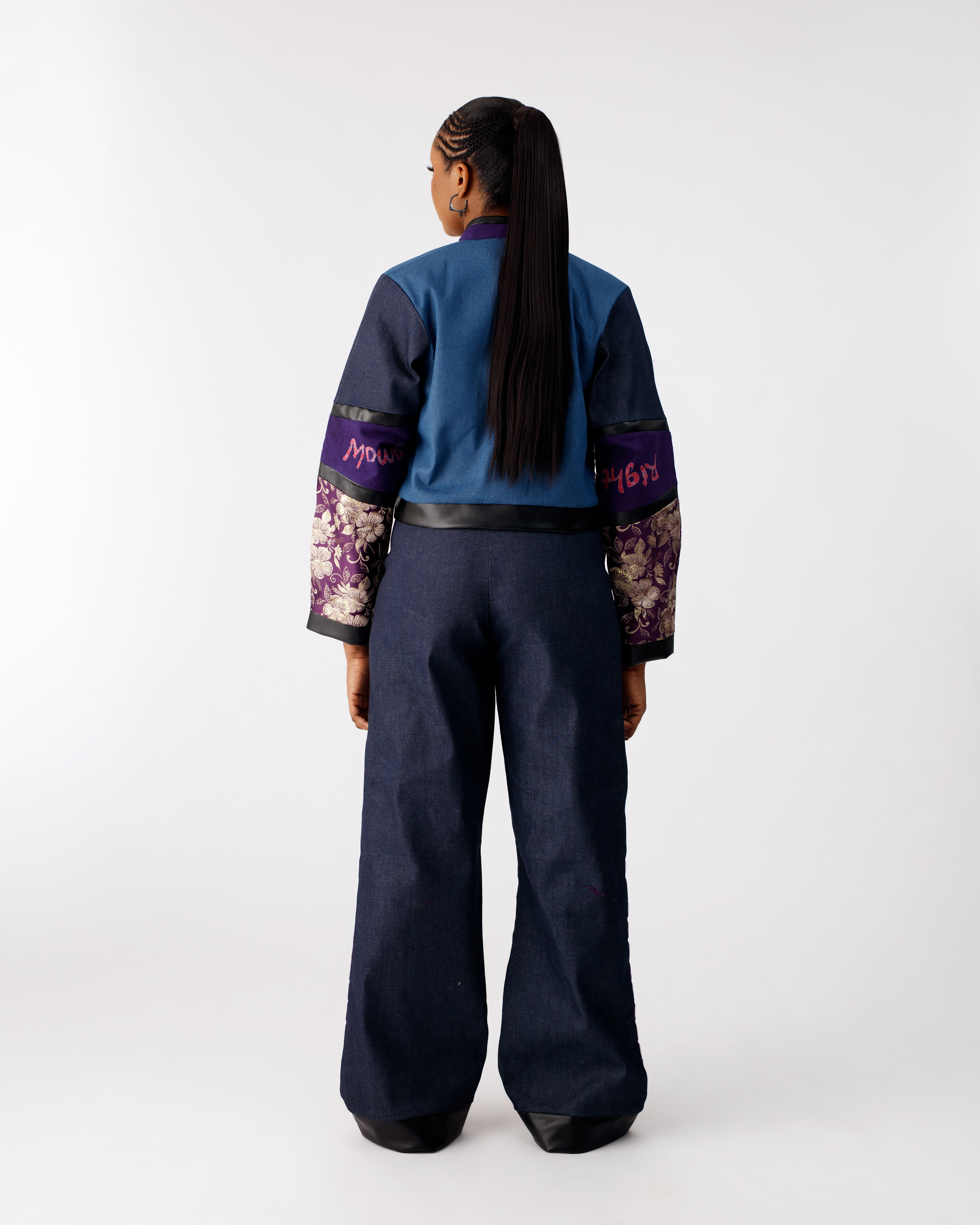 - An intentional blend of denim, leather, jacquard, damask, custom print Adire, and Aṣọ Òkè creates a rich interplay of texture and colour, mirroring the depth and diversity of womanhood.
