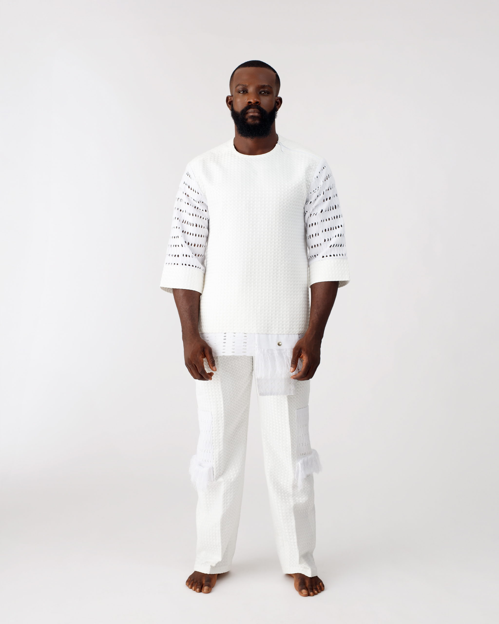 • The pants are made from textured cotton and detailed at the sides with Ónjáàwú Aṣọ Òkè and fringes, giving the set a well-crafted intentional finish.