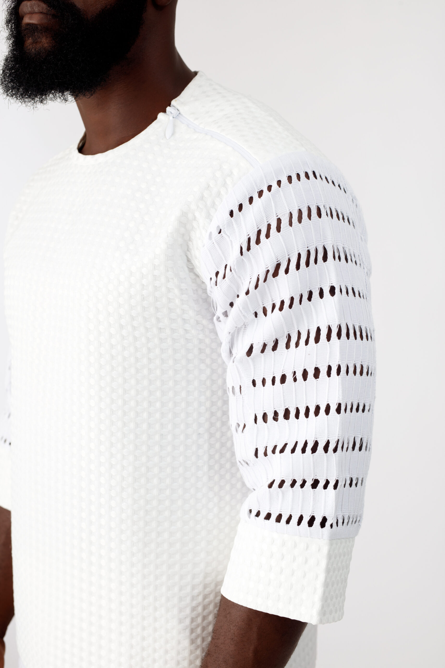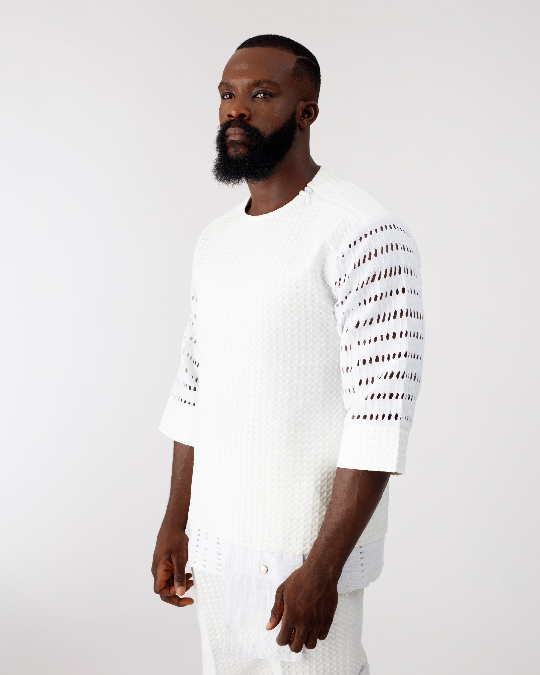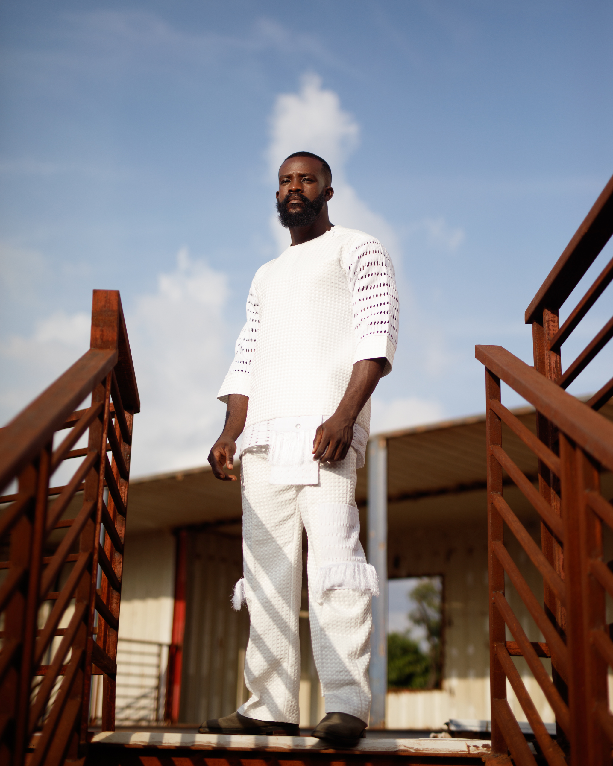 Udo from the Arúgbó Ọjọ́ collection, is a two-piece set that blends textured cotton with Ónjáàwú Aṣọ Òkè accents, creating harmony between tradition and modern aesthetics.